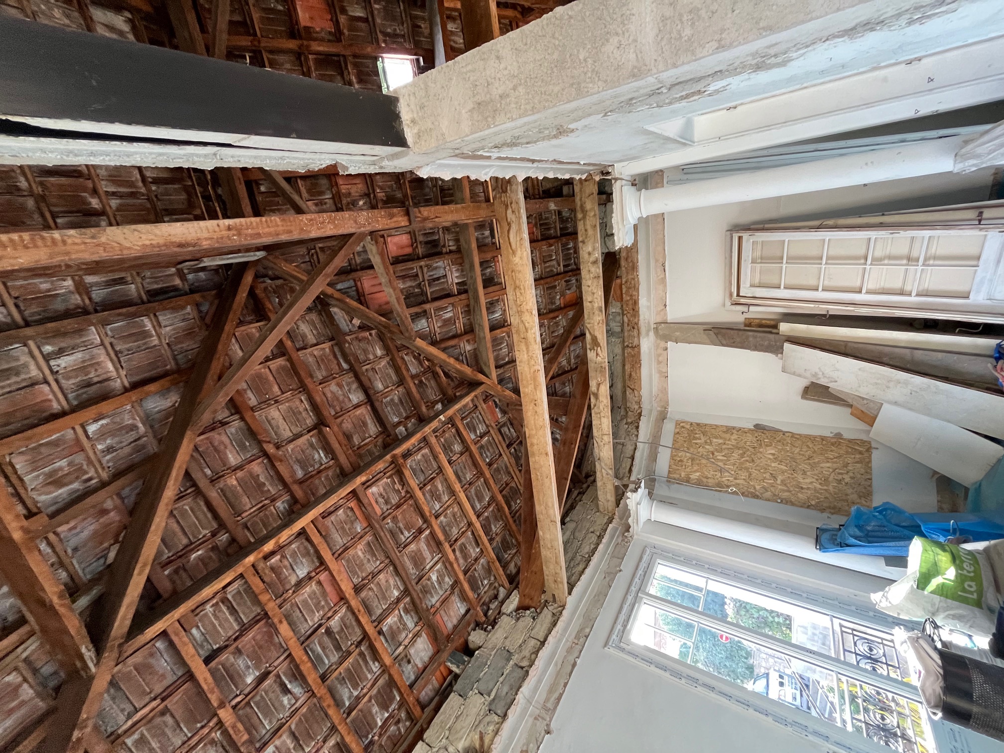 J'ai donc tout retiré et je vais donc installer de nouvelles solives, un nouveau plafond pour le R+1 et un plancher OSB pour les combles