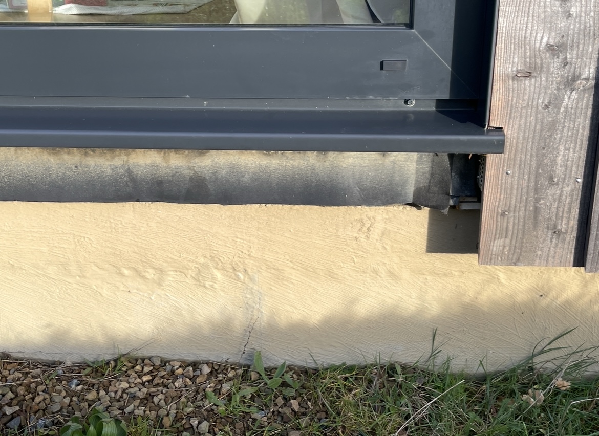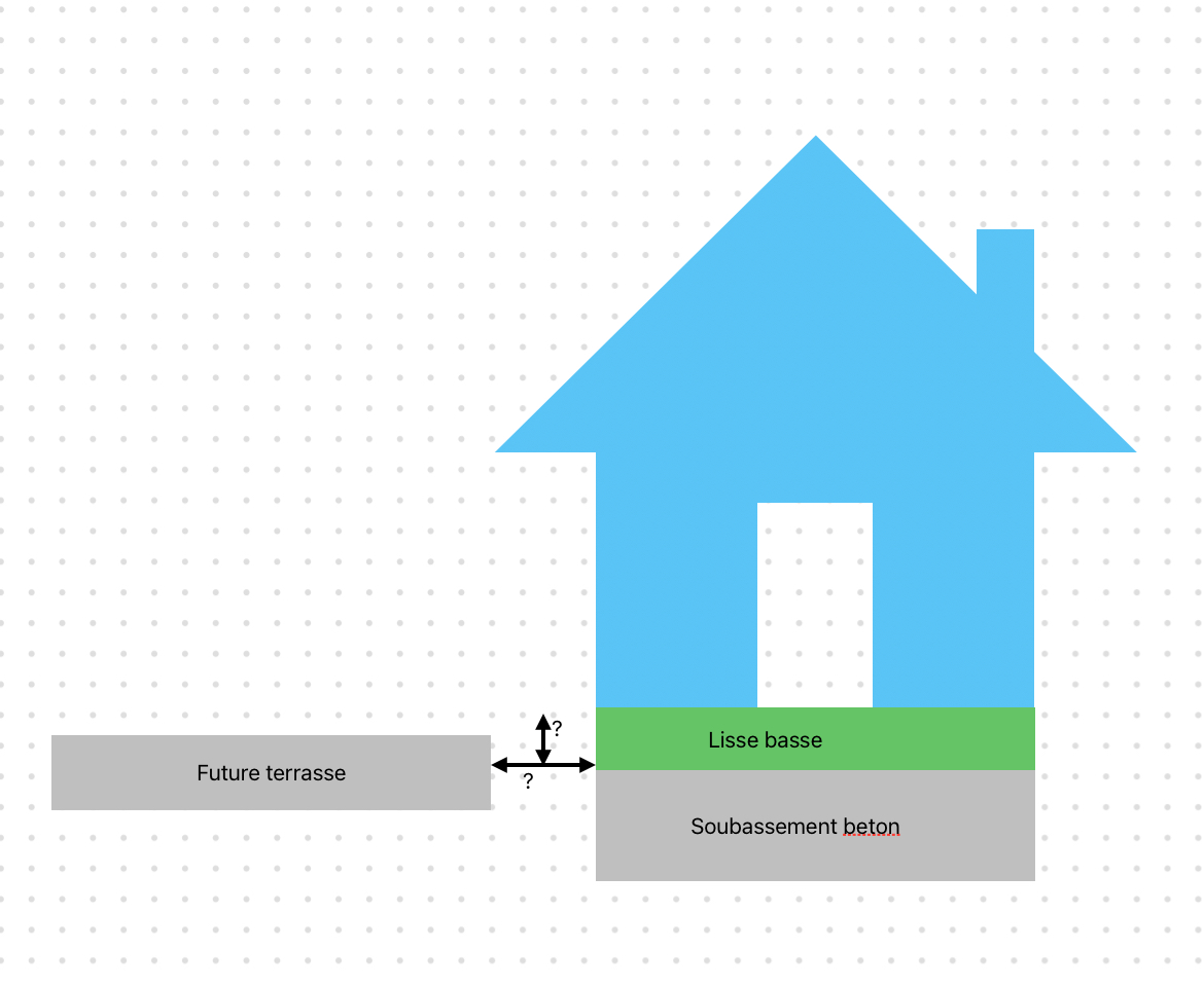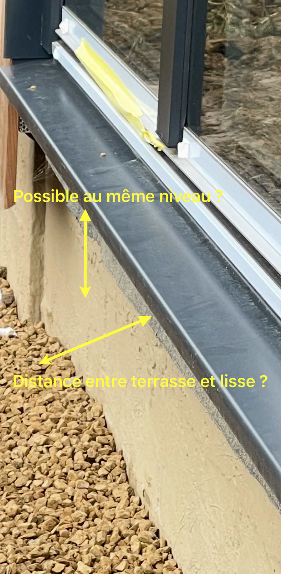 Je pense qu’il faut laisser un espace entre la terrasse et la maison afin la lisse basse puisse respirer mais je n’ai aucune idée de quel distance je dois laisser.