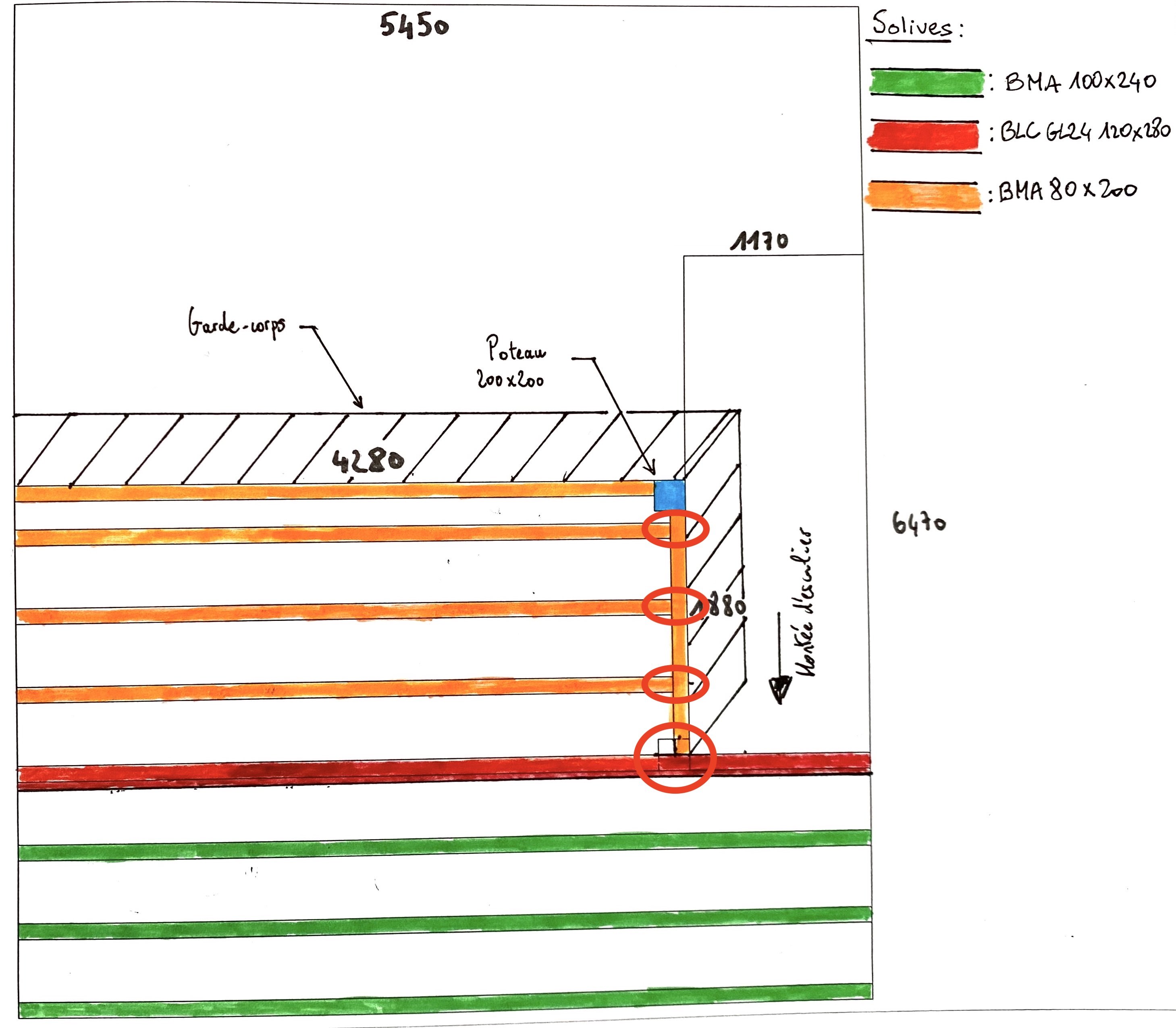 Ce poteau prenant appui sur l'extrémité d'une poutre du niveau inférieur en chêne sec de 250x250, elle-même reposant sur un pilier en béton de 400x400. Le piler en béton repose quant à lui sur le sol du RDC et sera parfait aligné avec le poteau du haut?