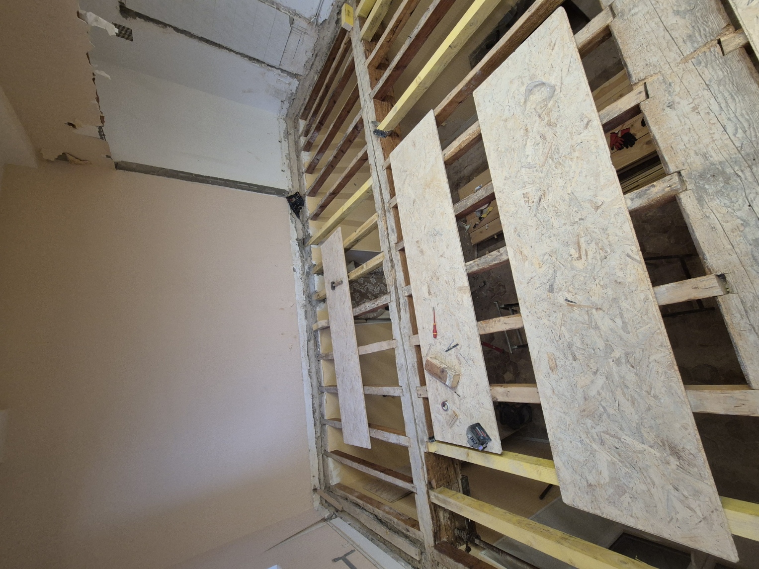 Je suis en train de rénover une maison de maitre des années 1820. Nous avons actuellement refait une partie des planchers en contre solivage (osb par dessus) et j'attaque maintenant la dernière pièce, qui se trouve au premier étage, la plus abîmée par le temps.