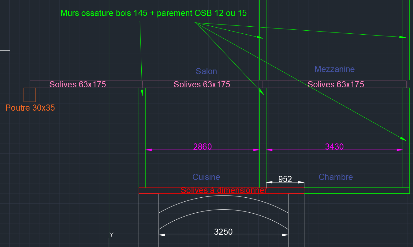 Ces solives vont devoir reprendre en charges réparties les 2m86 de cuisine et une partie des 3m43 d'une chambre (sur 6m50 de longueur) et une charge ponctuelle correspondant au poids des pièces de mêmes dimensions se trouvant au dessus.