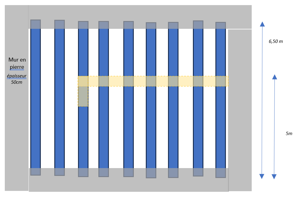 De l'autre côté, le mur en brique est parallèle aux solives et repose
