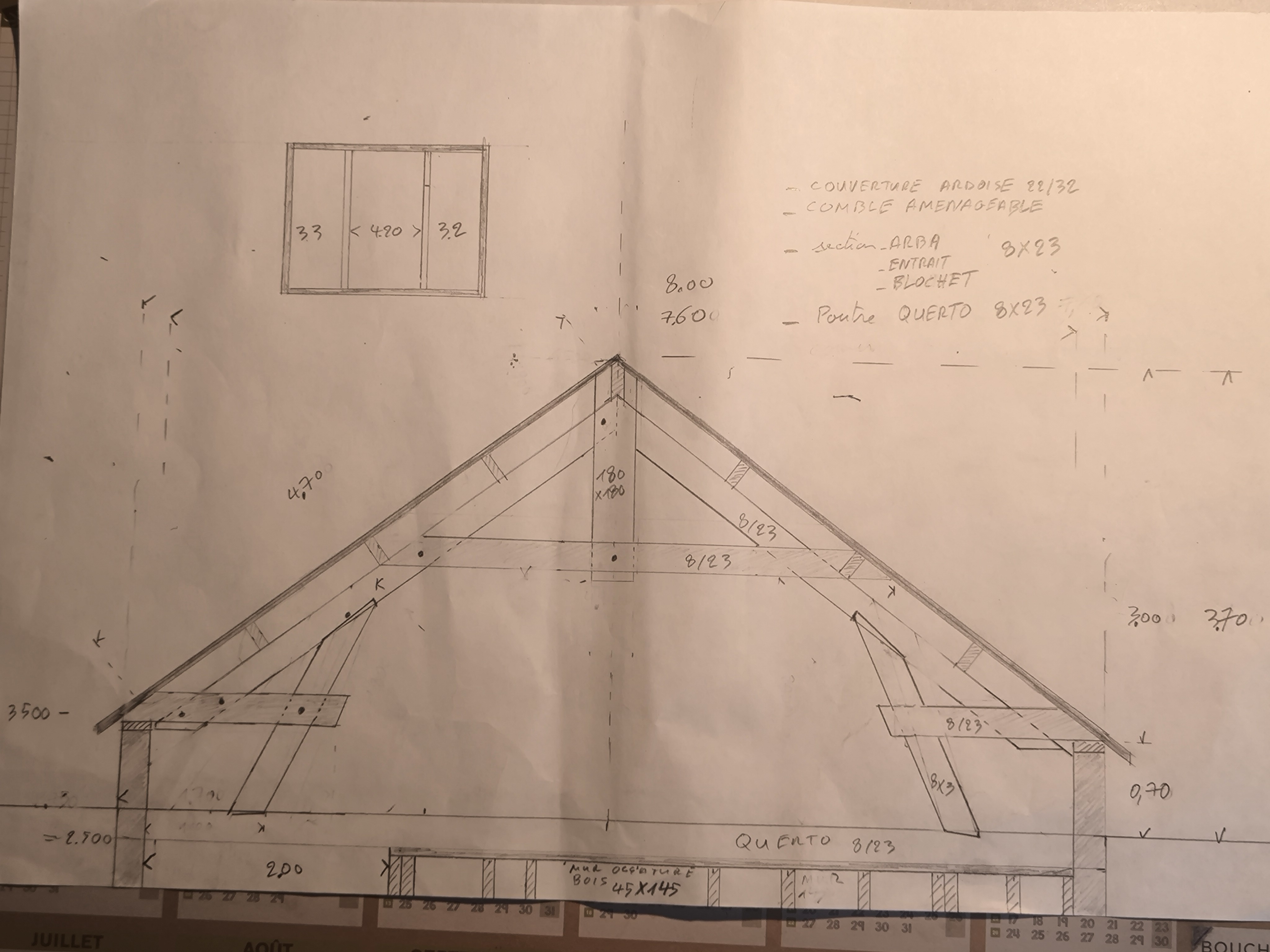 Je vais faire une charpente de bois avec couverture ardoise sur une maison en brique avec les murs intérieurs en ossature bois pourriez-vous me donner votre avis sur la section du bois et le positionnement des blochets