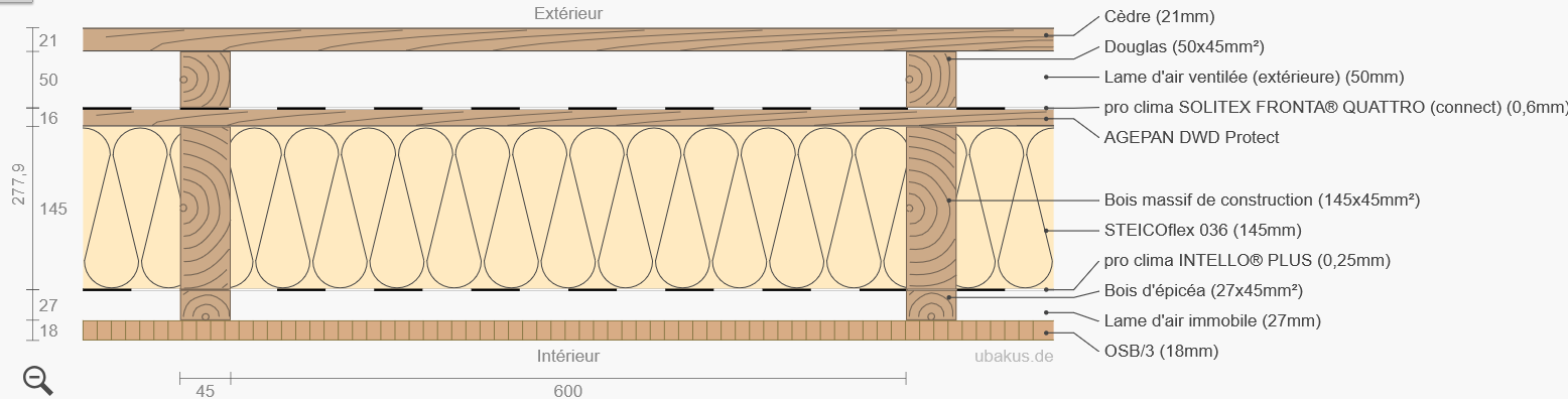 Celui-ci est composé d’une ossature bois en 145, fermée par des panneaux en dfp 15mm, un pare-pluie (Pro Clima Solitex Fronta Quattro), une contre-ossature de +- 50mm, et un bardage. Il n'y a pas de ventilation pour l'instant (ie pas d'aération).