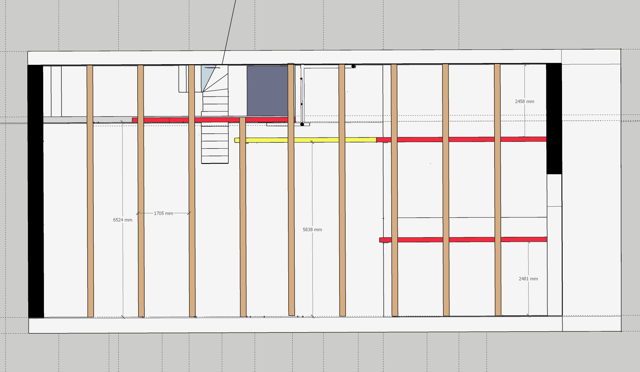 Les poutres sont dans le sens de la largeur, de section 40x20cm avec un entraxe de 1m70. Elle sont soutenues à certain endroit par des ipn sur poteau (voir schéma) marqués en rouge (celui marqué en jaune sera un ajout pour soutenir une reprise de charge de mezzanine)
