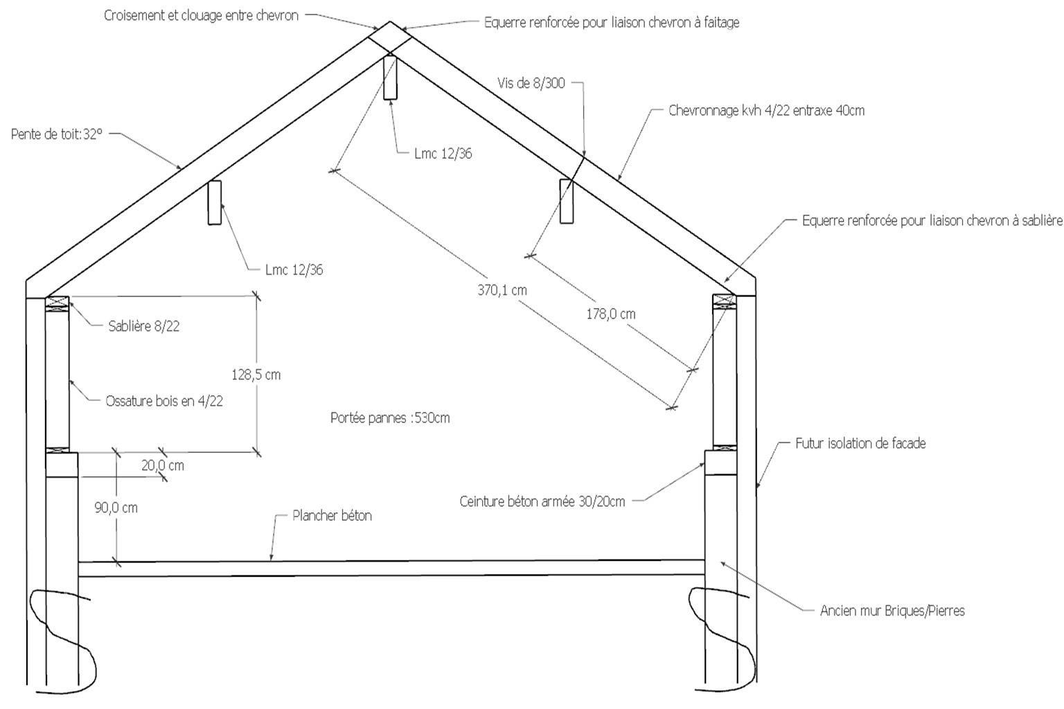 Pour une question d’esthétique et de facilité d’isolation (insufflation de ouate de cellulose entre chevrons), j’aimerais me passer d’entraits et compter sur le surdimensionnement des pannes et chevrons qui, en réduisant au maximum leur flèche, j’espère annuler ou du moins fortement limiter la poussée sur les murs.