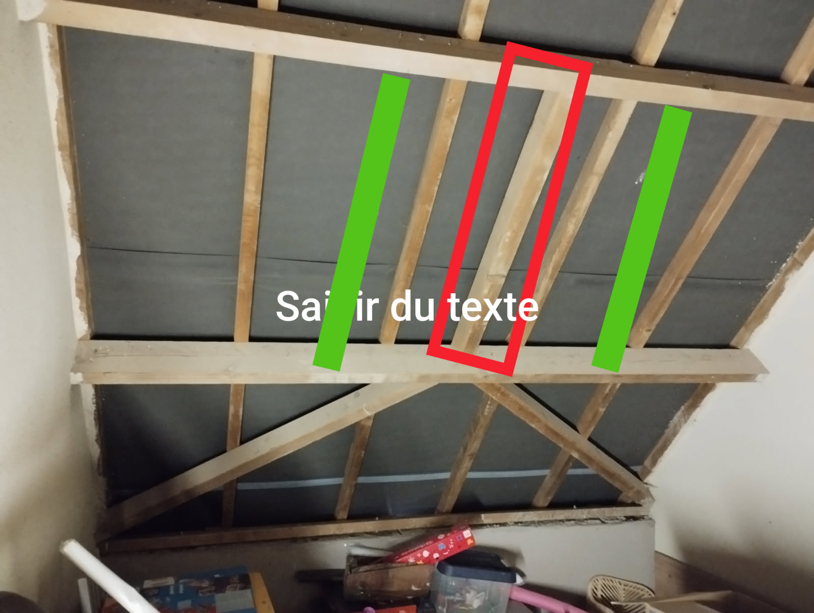 L'idée serait de supprimer la partie centrale (rouge) pour y encastrer un velux (photo 3) et reprendre la charge existante par de nouvelles sections (vert).