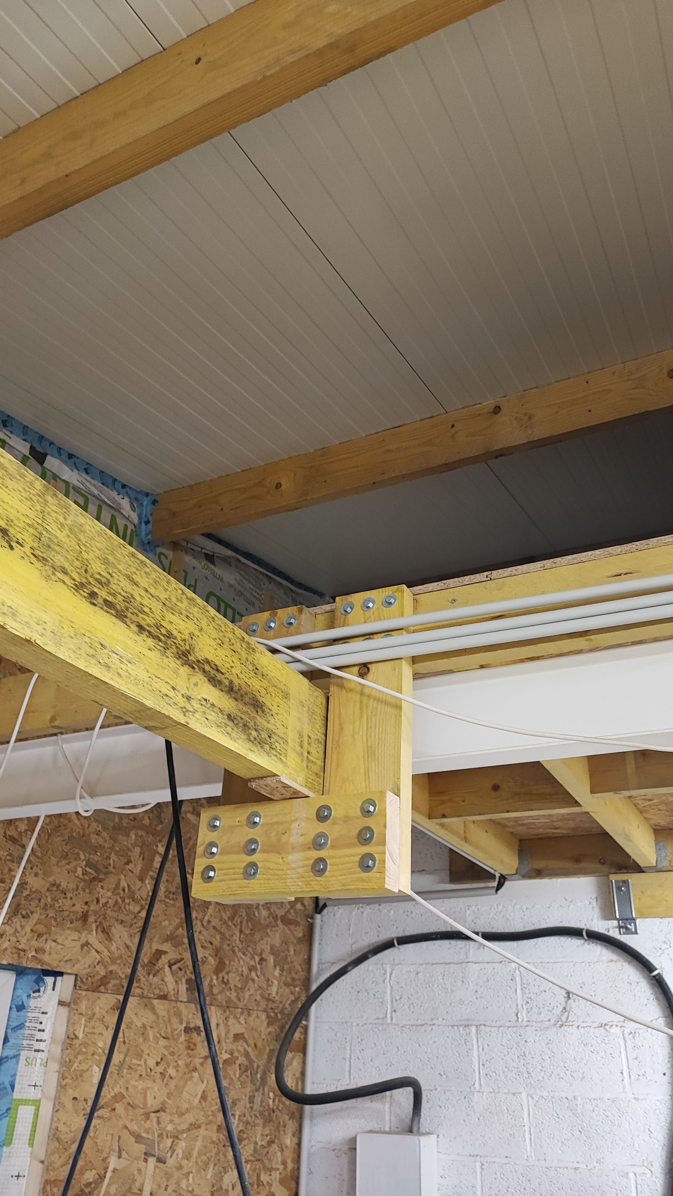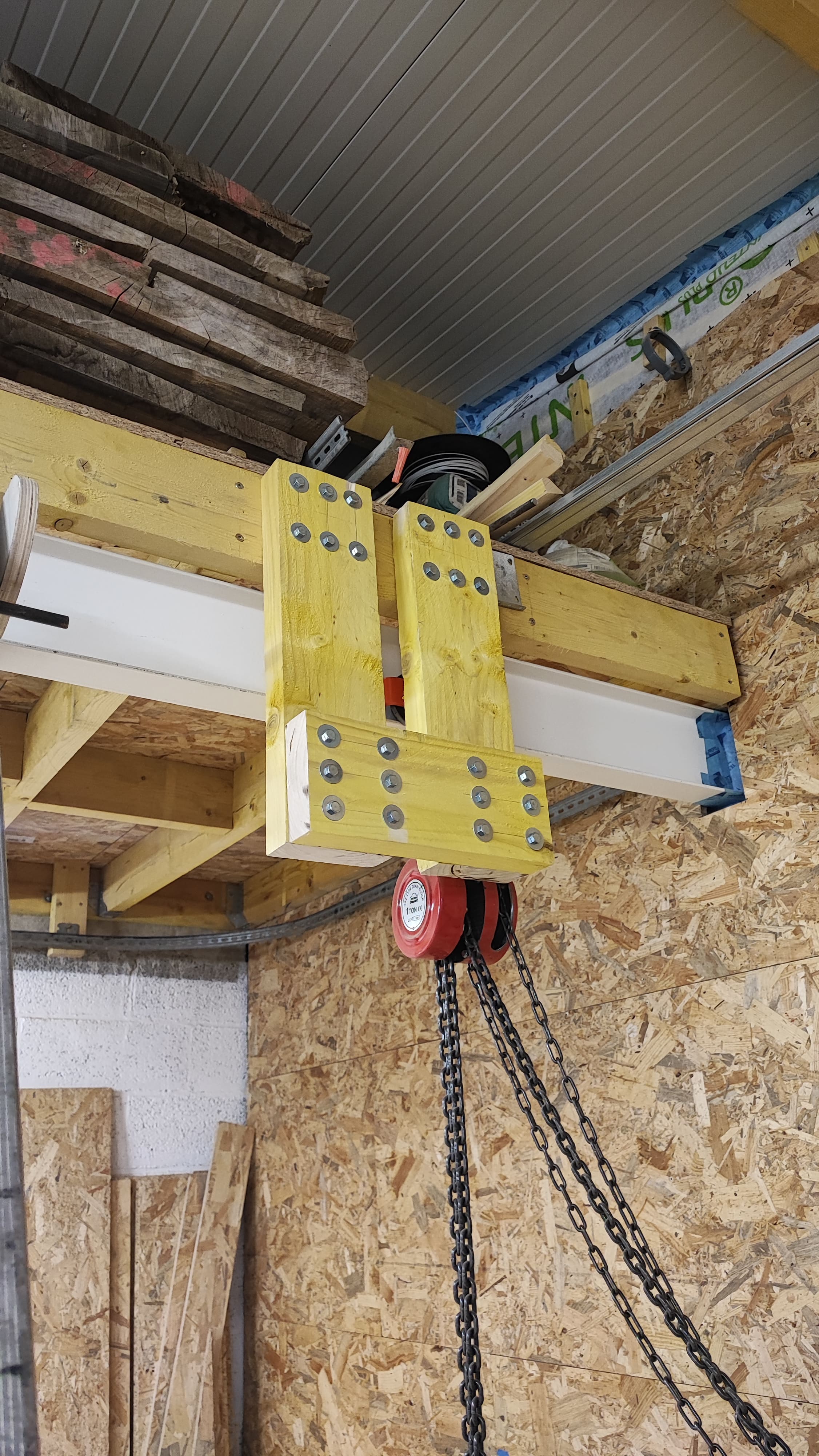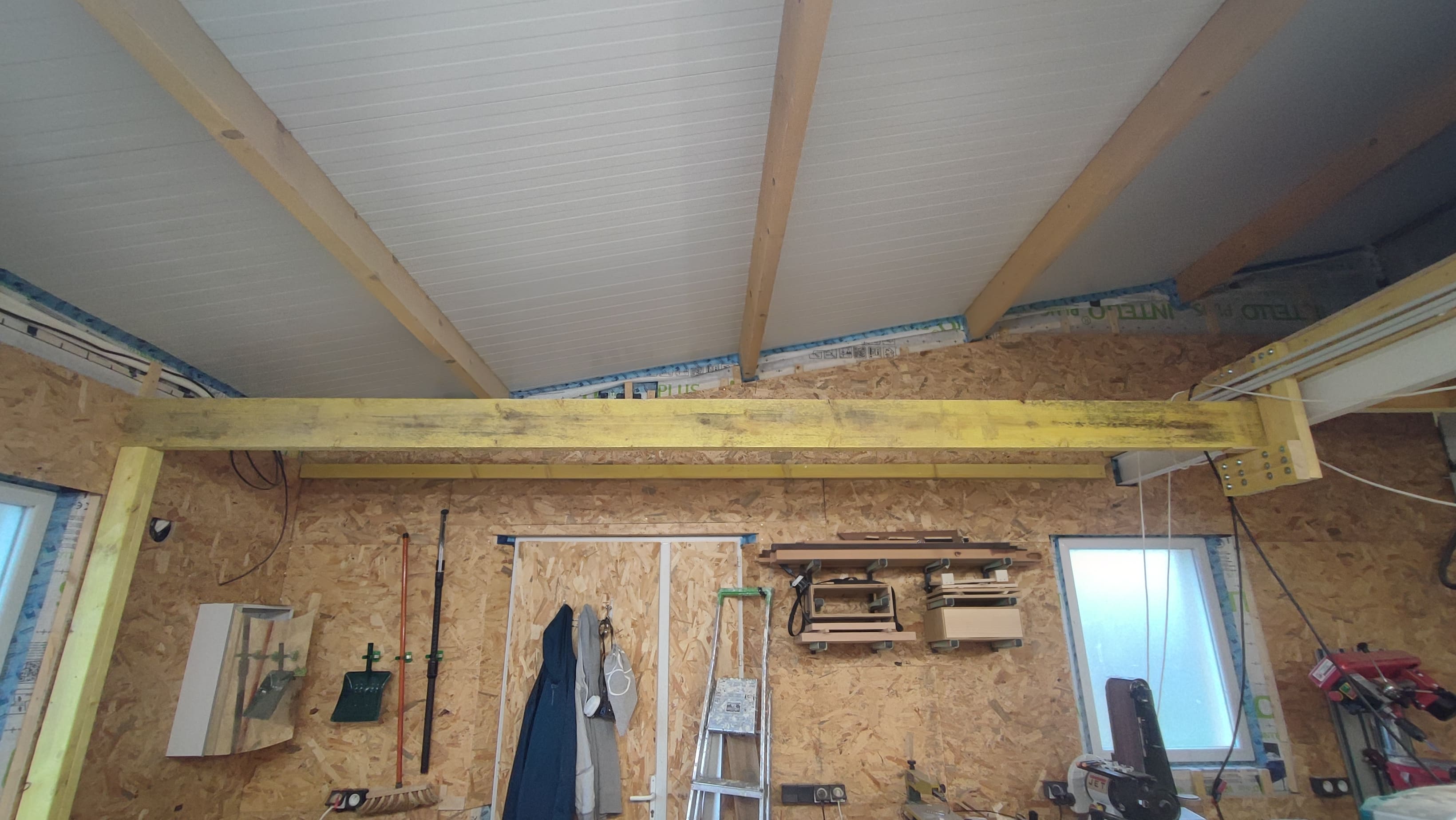 L'avant sur une poutre 63*200. Cette poutre repose d'un côté sur un poteau qui n'est pas le sujet ici. L'autre sur un étrier en bois que j'ai fabriqué et que j'ai fixé à ma mezzanine.