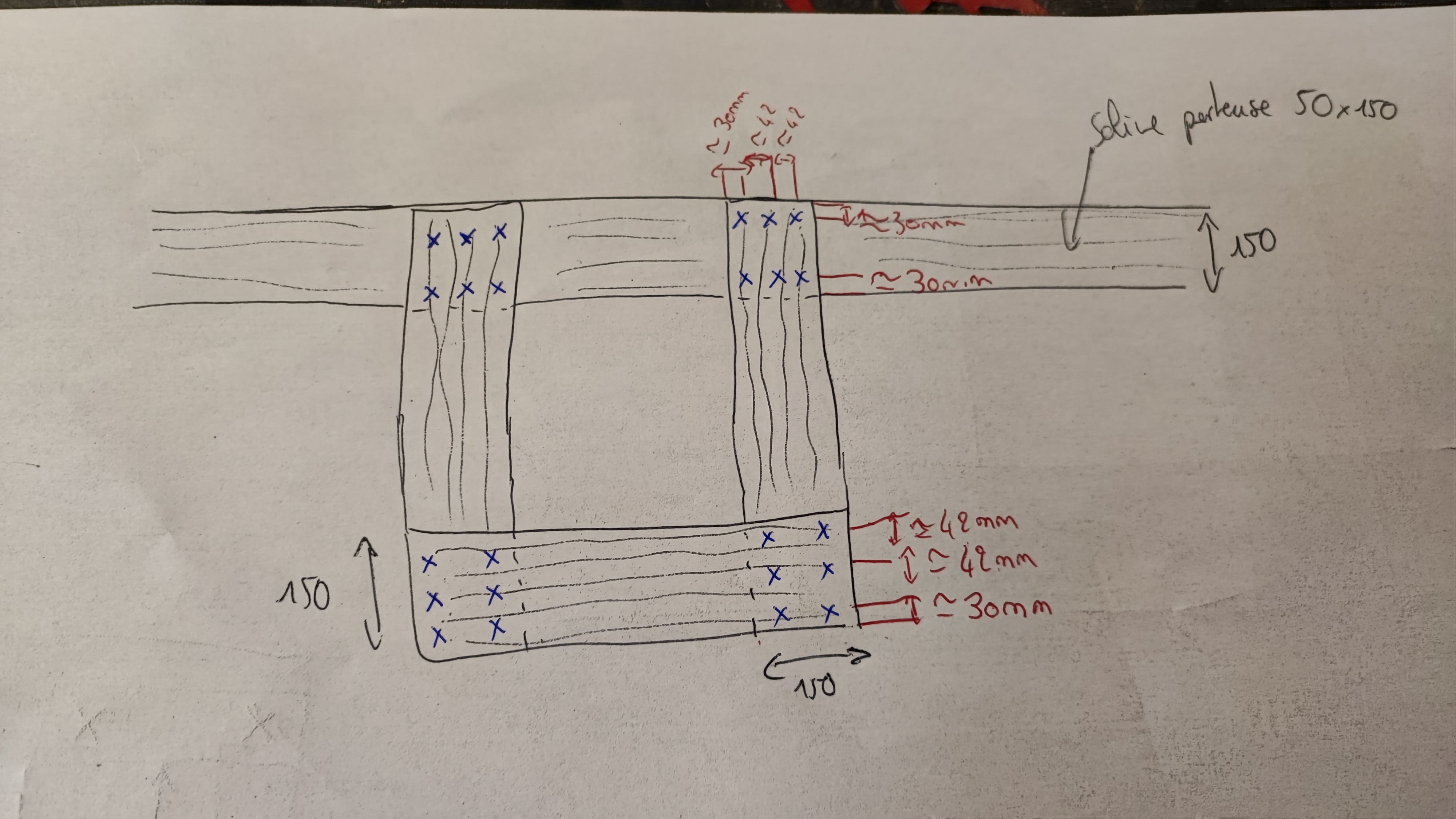 Ma question concerne les assemblages de mes étriers bois. Je vous montre des photos. Ainsi qu'un schéma avec quelques côtes. Je me suis posé des questions concernant les distances aux bords chargés. Notamment je suis à environ 30mm des bords dans le sens du fil vs 56mm préconisés je crois.... je pense ne pas être dans les clous. La charge que je devrais porter sur ce point se situe entre 300 et 400kg.