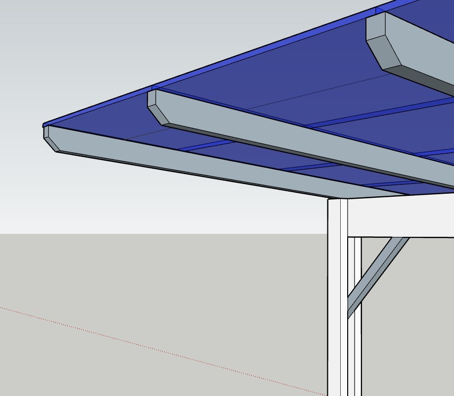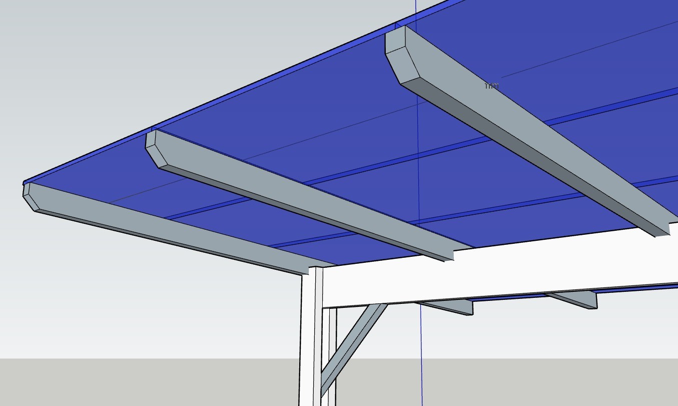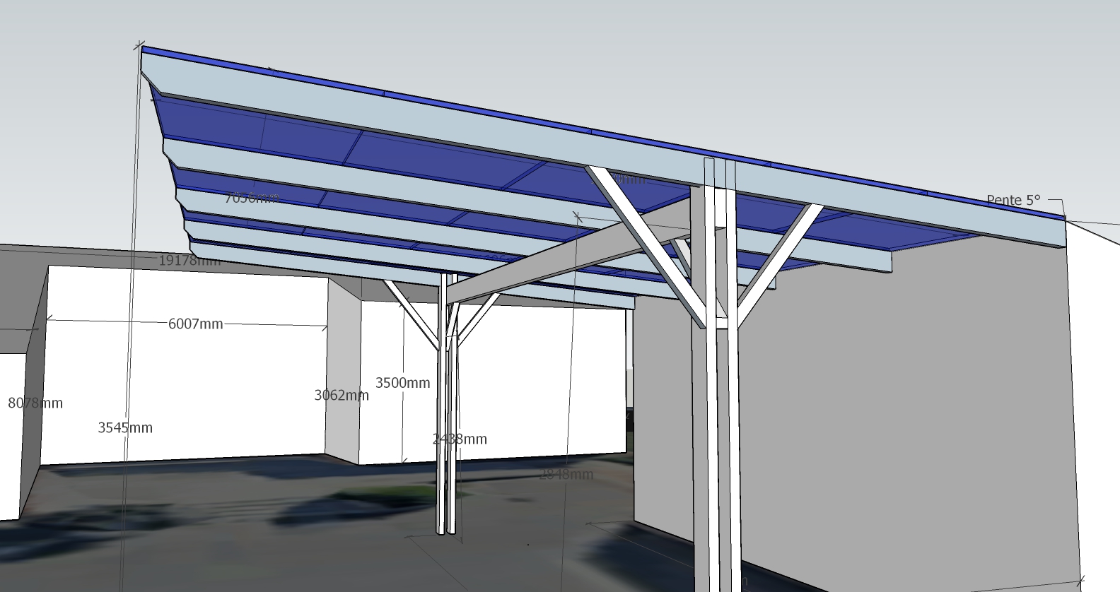 - 5 traverses de 6m de long (180x60) espacées de 1,75m, fixées par sabots sur le mur de droite et sur poteaux + poutre en leurs milieux (3m de porte à faux). Pente de 5°