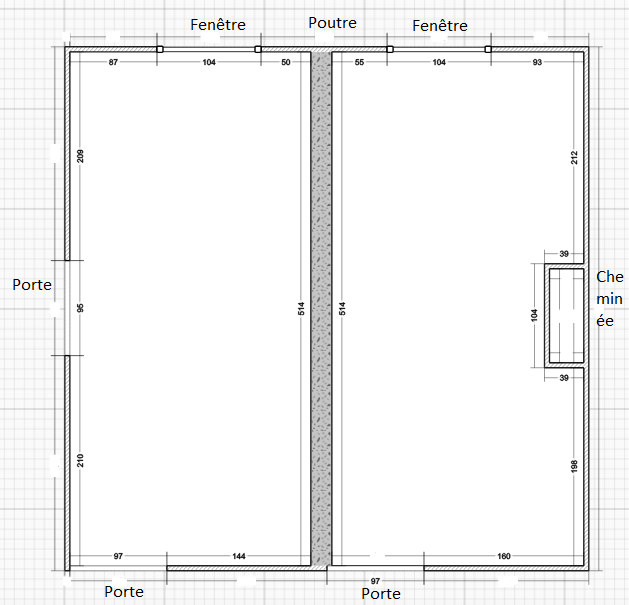 Je joins en image un plan avec les différentes dimensions et une photo de la pièce en question. Il s’agit d’une pièce de vie qui fait 514 cm sur 514 cm. Le solivage précédent était mis perpendiculairement par rapport à la poutre porteuse en chêne (210x288mm) qui traverse la pièce. Les anciennes solives en chêne faisaient 100x100mm et étaient disposées avec un entraxe de 50cm. Elles étaient posées dans le mur (côté pignon/cheminée avec une portée de 252 cm) ou sur une lisse qui termine le haut du mur (côté intérieur opposé avec une portée de 241 cm).