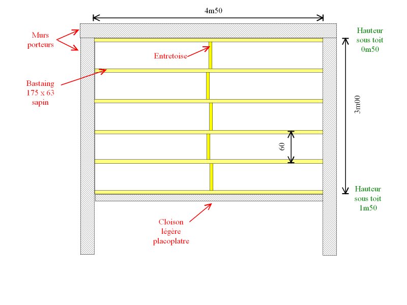 Je souhaite donc créer un plancher à 2m70 de hauteur sous lequel sera suspendu un plafond monté sur des rails métalliques.