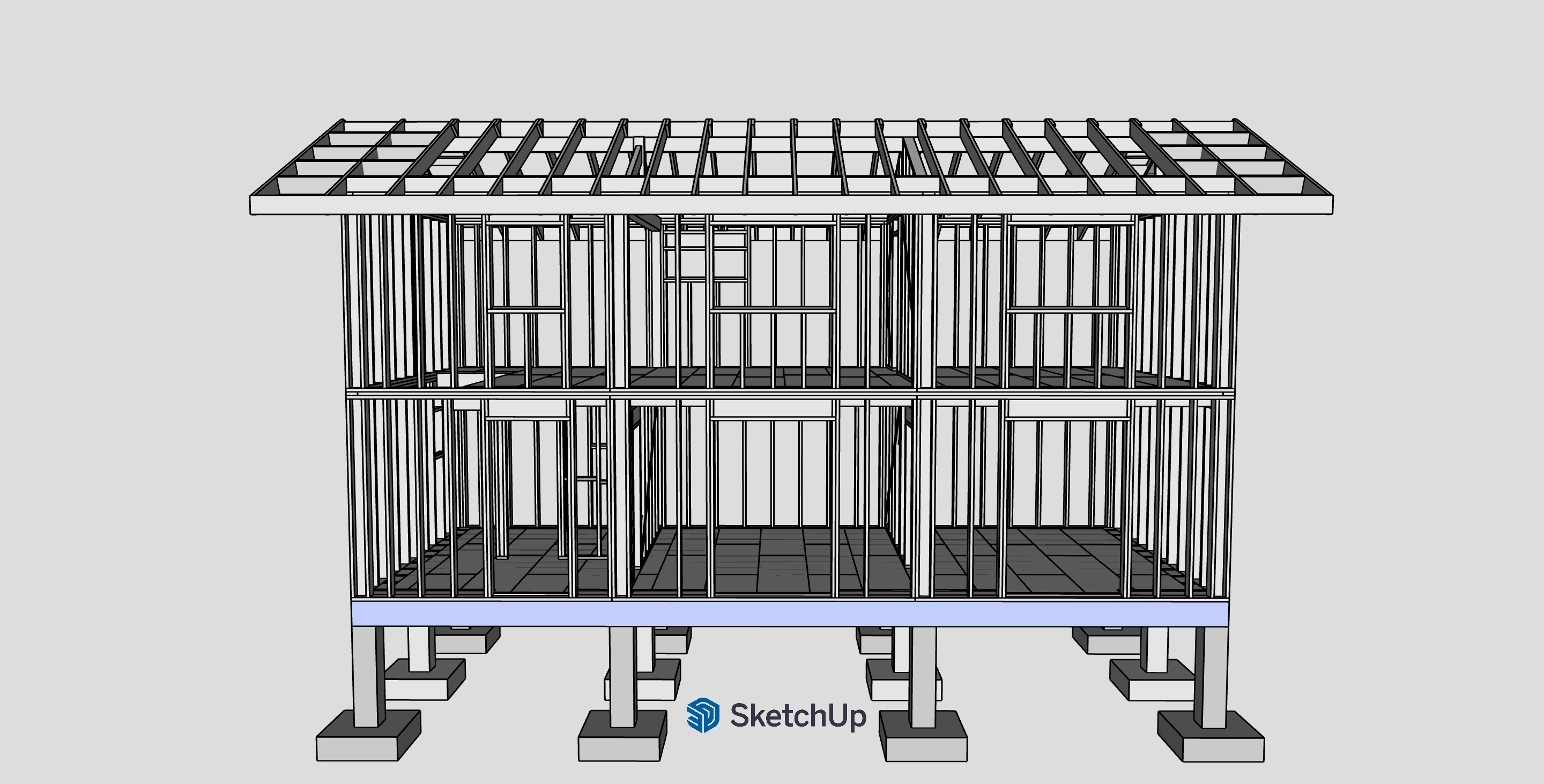 La maison fera 11x5m avec un étage et une toiture double pans. Le contreventement se fera par liteaux en diagonale vissés dans chaque montant ("technique feuillette"). Il y a un mur de refend (ossature 45x145 comme les murs) situé à 3,6m du pignon Est et une ferme de toiture située à 3,20m du pignon Ouest (et fixée au mur Nord et Sud par des sabots). La couverture sera en bac acier puis de l'extérieur vers l'intérieur : liteaux/contre-liteaux/pare-pluie souple/agepan (22mm)/isolation fibre de bois entre chevrons 200mm+100mm croisée sous chevrons/frein-vapeur/volige.