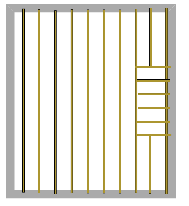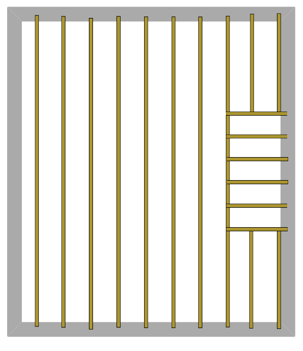 Les solives perpendiculaire sont de même dimension que les autres et sont encastrées dans le mur de refend et liées par tenons et mortaises à mi-bois dans la solive verticale et les deux bouts de solives situées de part et d'autre de la trémie sont aussi prises dans les murs extérieurs et liées par tenons et mortaises à mi-bois dans les solives perpendiculaires de la trémie.