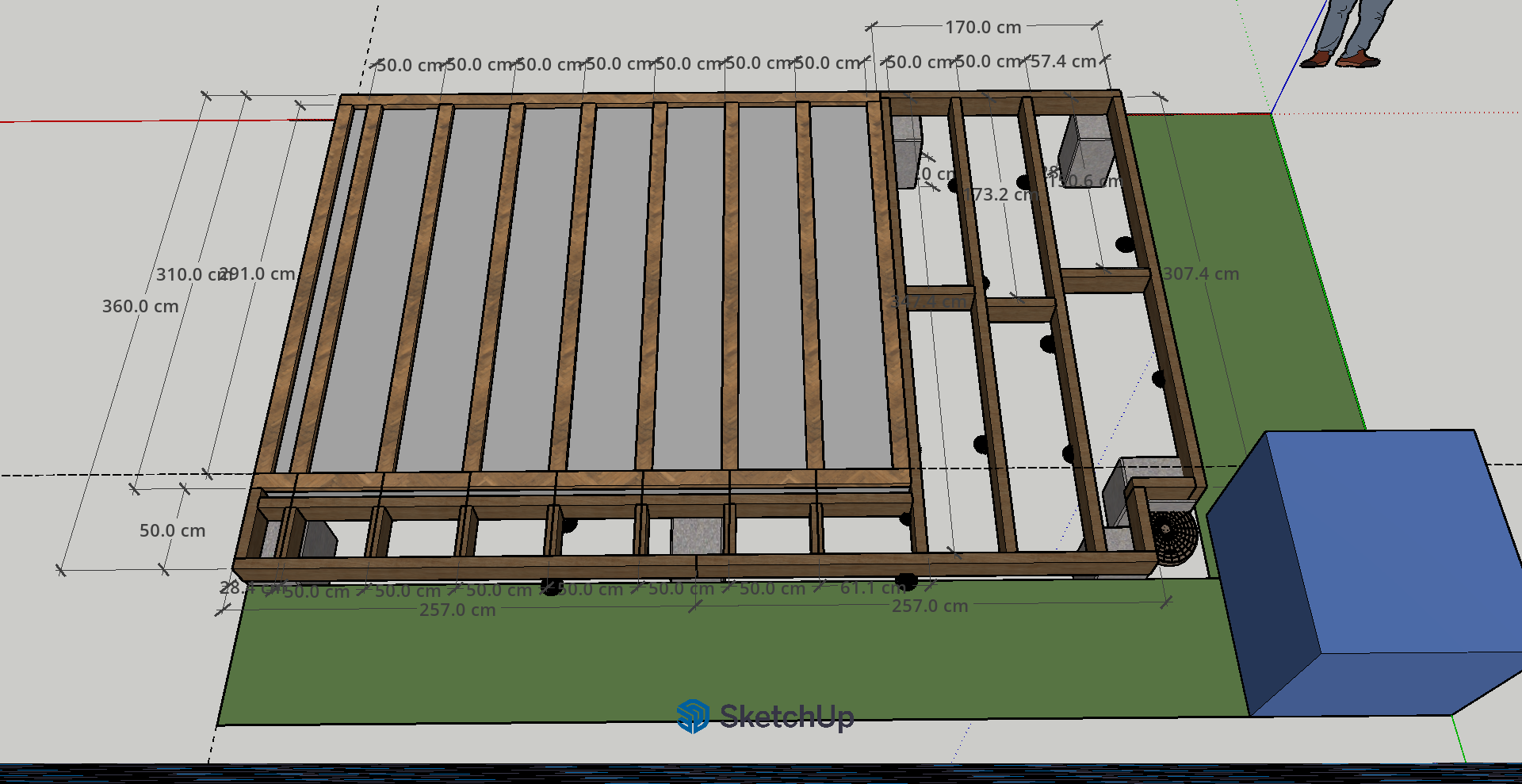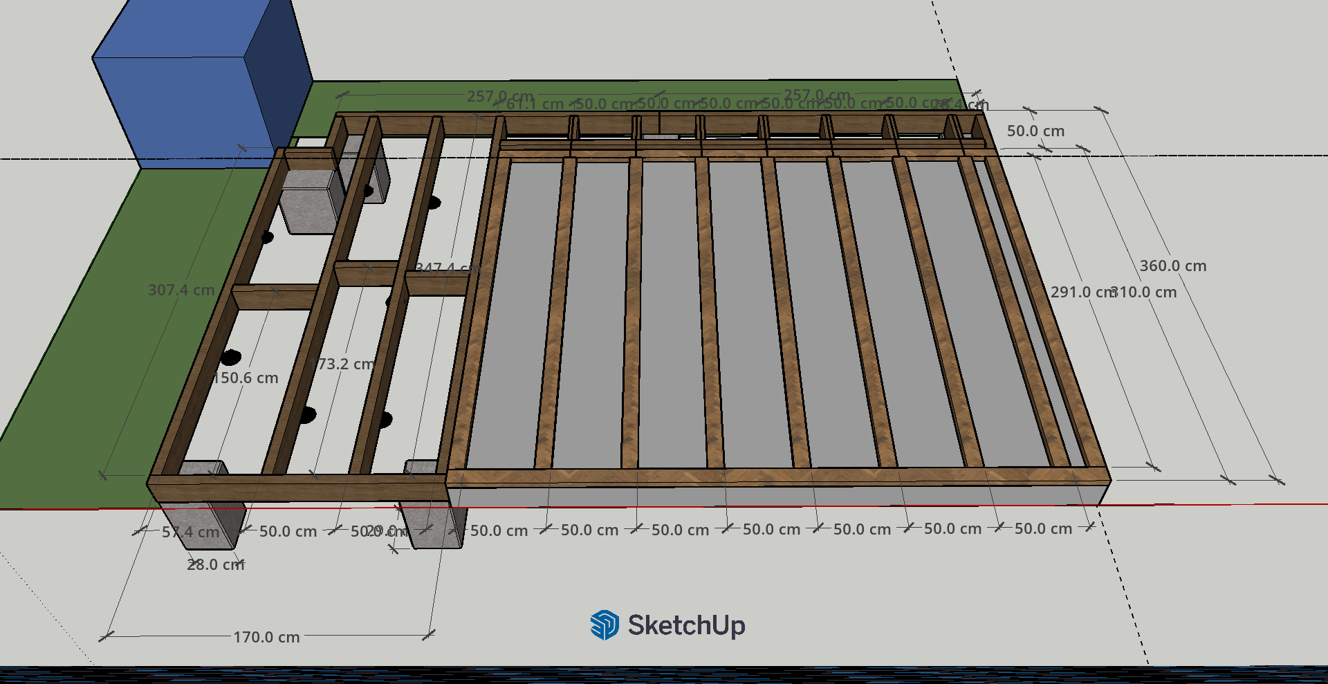 Cet abri actuel est posé sur une dalle béton. Je souhaite agrandir cette dalle avec du bois et ensuite poser mes murs en ossature bois dessus.