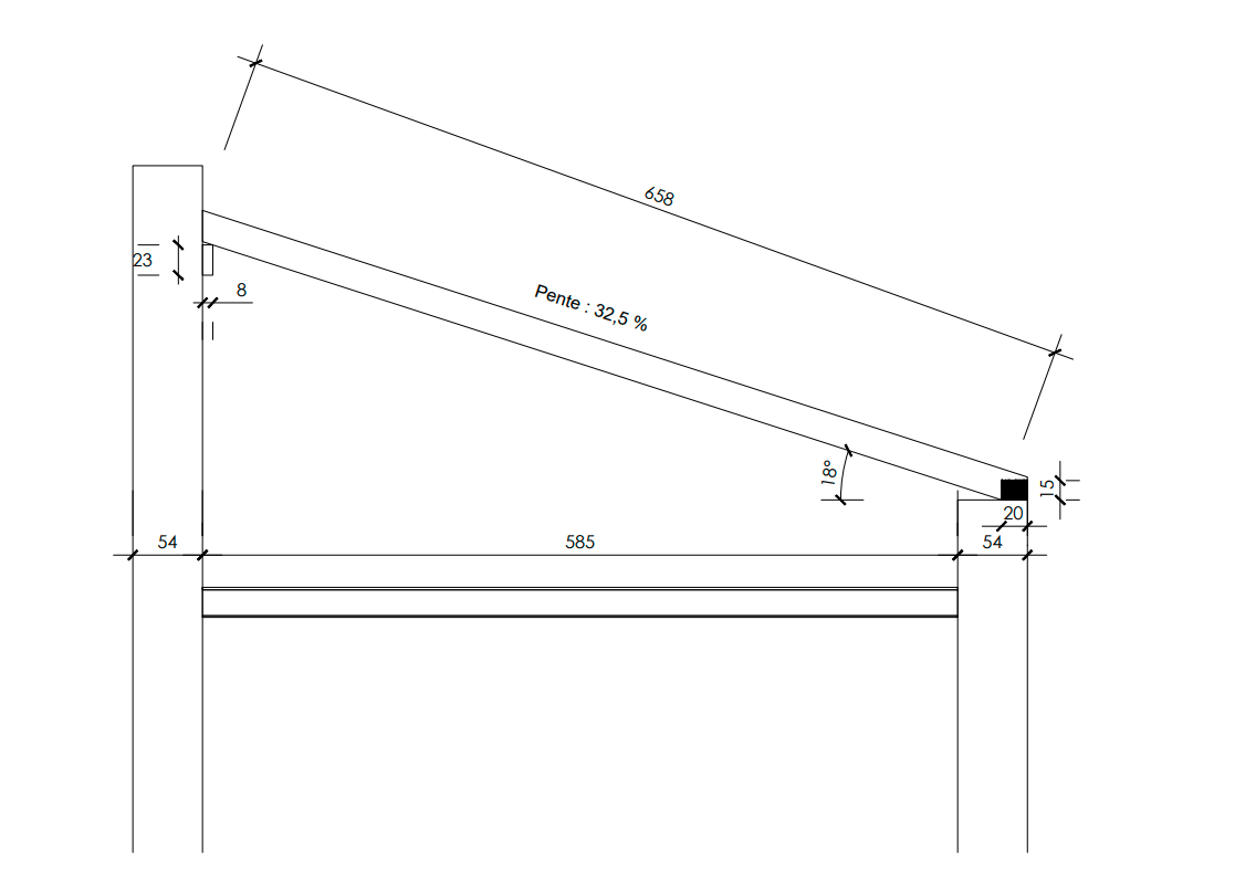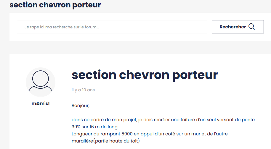 Je restaure un vieux chais dans le libournais (Gironde). Je choisis une charpente chevrons porteurs pour que rien ne soit visible de l'intérieur de l'habitation. Le problème c'est que la portée est de 585 cm entre appuis. Je prévois une pente à 30 % donc chevrons d'environ 620 cm de long. Ils supporteront une toiture en tuiles romanes avec 24 cm de fibre de bois entre chaque chevron et un plaquage BA13.