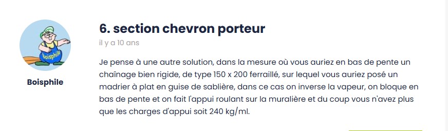 Les chevrons seront bloqués en pied par un chainage en BA. En partie haute ils reposeront sur une muralière fixée, dans un mur en pierre de Libourne, par des tiges filetées et scellements chimiques