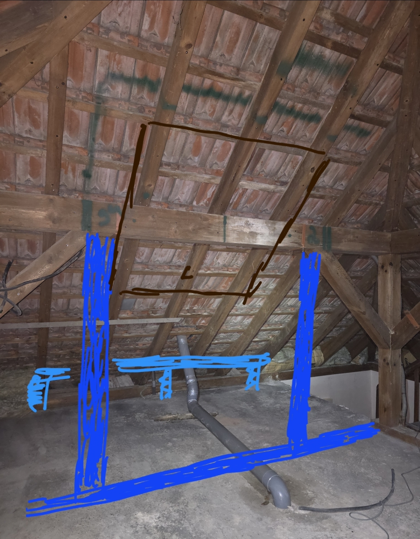 Sur la photo, en brun la dimension du velux / chevetre, 3 chevrons seront concernés par cette modification ainsi que la panne intermédiaire.