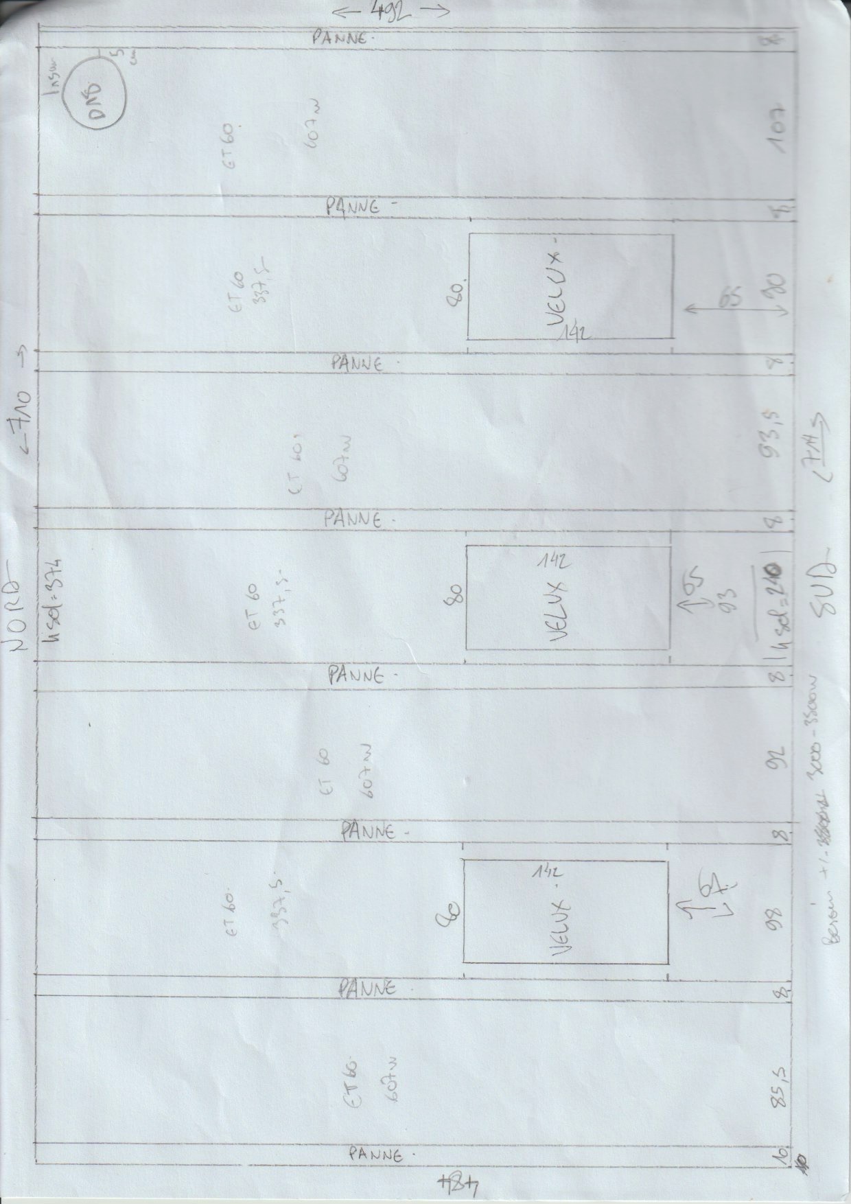 Il s'agit d'une vieille grange en toiture mono-pente que je rénove. Il n'y a pas de chevrons mais de simples madriers (75x225) pris dans la maçonnerie de chaque côté dans le sens de la pente ; La portée de ces madriers est variable de 4,84 à 4,92m. Les madriers sont espacés entre eux à une moyenne de 94cm (variable de 85,5 jusqu'à 107cm). Je vous mets un plan de la structure, j'espère que vous saurez vous y retrouver.